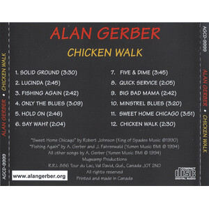 Gerber's career spans three decades, starting as front man of the group Rhinoceros many years ago. He toured along side BB King, John Lee Hooker, Procol Harum, The Moody Blues, Chuck Berry, Little Richard, Canned Heat, Jeff Beck. He has written songs for Bob Dylan's film 'Renaldo and Clara' and Written and directed scores for children's productions. Alan Gerber's current efforts include the recording of several solo albums. (Chicken Walk, Fools That Try, Boogie Man & Alan Gerber Live For A Limited Time Only.) These albums scored 5 stars and the "Top Pick" seat in Hour Magazine with heavy airplay on radio worldwide.