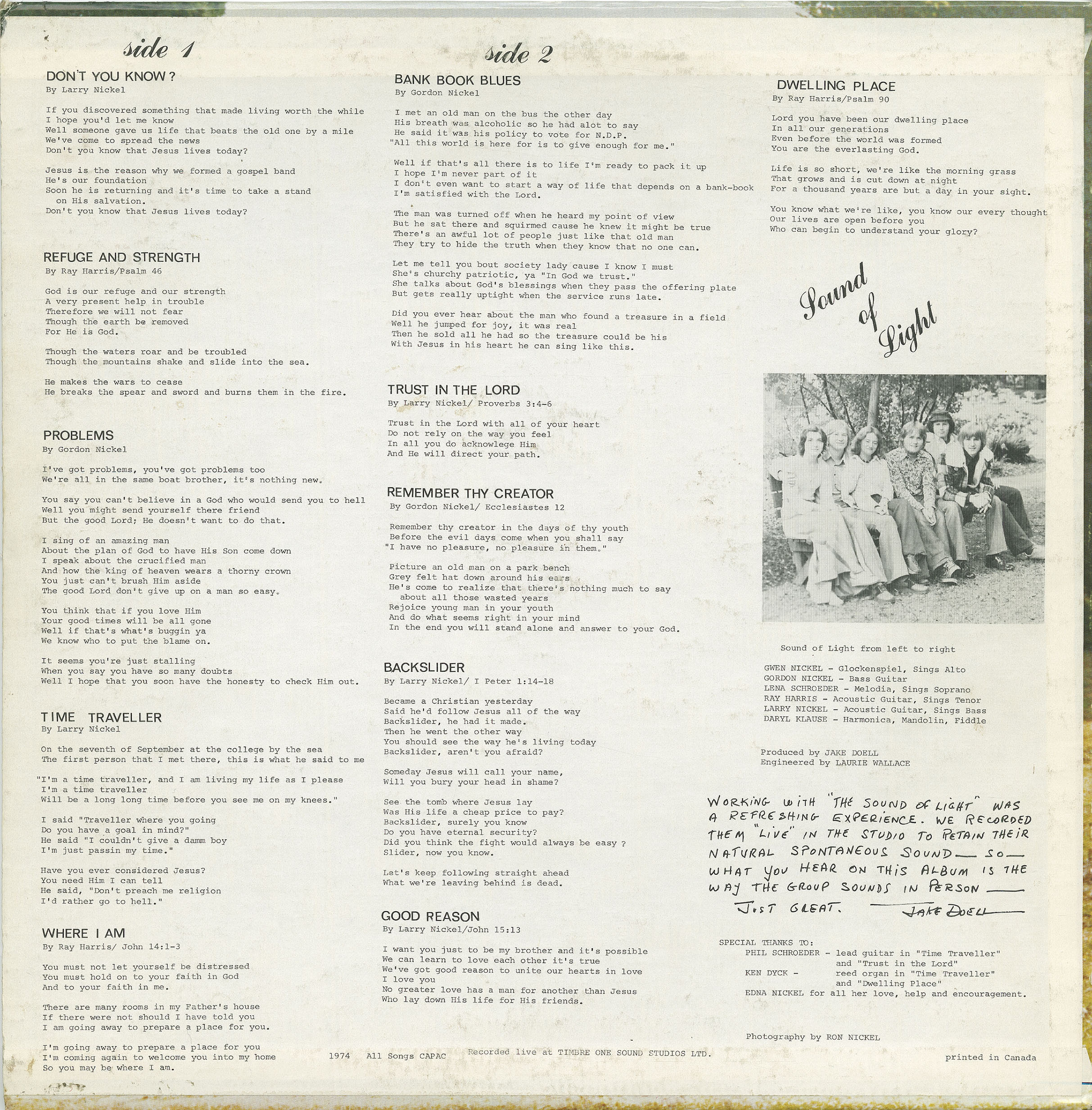 The SOUND OF LIGHT was a coffeehouse band that performed in the Vancouver area for five years. Larry Nickel, 18 years old, formed the group in 1970. Lena Schroeder, soprano, was the first to join. Gordon Nickel (Larry’s brother) – played bass and Gwen Dueck became the alto. Then Ray Harris (tenor) and Darryl Klause (mandolin, fiddle and harmonica) came on board. Gordon, Ray and Larry were the song writers – often collaborating on ideas. Phil Schroeder can be heard playing a guitar solo on “Time Traveler”. Other notable band members were Heinz Borck (tenor) and Ben Neumann (violin, mandolin). Other keys players were our managers; Edna Nickel and Peter Hauser.