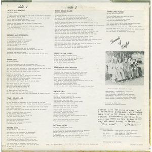 Six-person Canadian male/female folk outfit with quaint appealing acoustic style. Clean folksy harmonics of the Gamble Folk or New Creation (Experience, Folk Sound Of Freedom) variety, joined to light rustic instrumentation that includes mandolin, harmonica, melodica and fiddle in addition to the acoustic guitars and electric bass. Bluesy moves on ‘Time Traveller’ (good lead guitar) and ‘Bank Book Blues’. Other titles: ‘Refuge And Strength’, ‘Problems’, ‘Remember Thy Creator’, ‘Backslider’ and ‘Good Reason’. The songs were recorded “live” in the studio in order to retain their “natural spontaneous sound”.