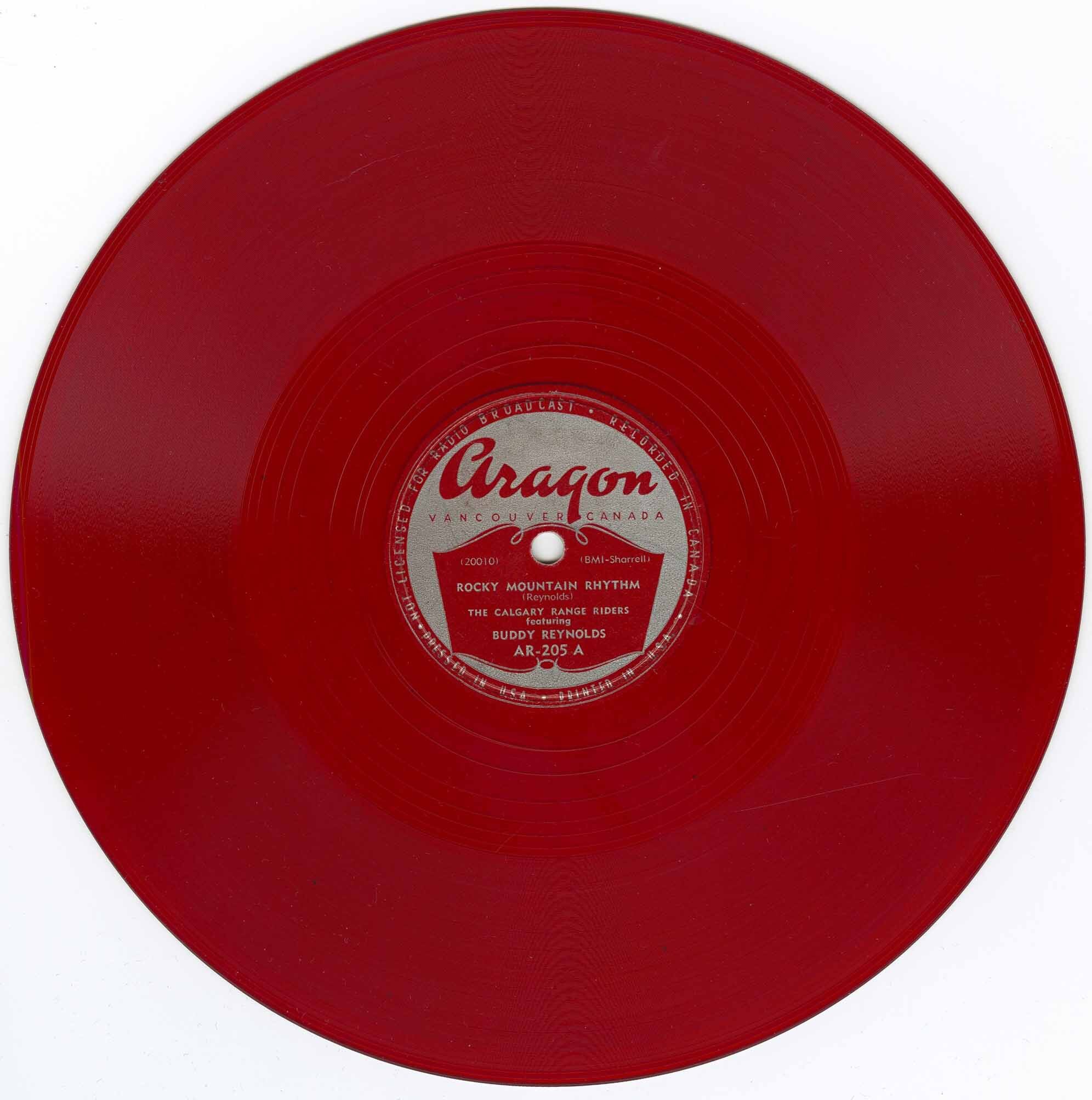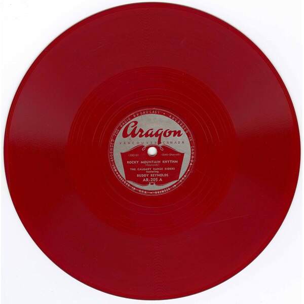 Also note that although Rocky Mountain Rhythm is available on the Calgary Range Riders Aragon LP, Buddy's vocal intro "As I strolled by a ballroom, I heard those violins play" was not kept as a part the LP issue of the tune, making this 78 the only place you get the entire performance.