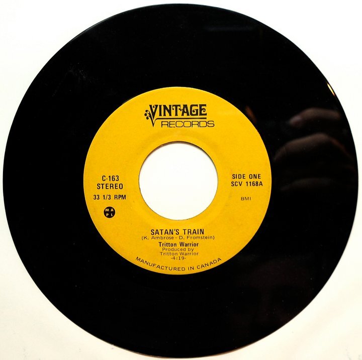 Triton Warrior, named for sea-god Neptune’s son, devised a self-styled “gravel rock,” hammering it out during practices in Fromstein’s family basement. The youths signed justice-of-the-peace notarized waivers, as to legally play local bars and clubs, touring only occasionally outside a 40-mile Toronto perimeter. Recordings commenced at Sound Canada before 1972’s end, resulting in a 2,000-copy run of singles on Vintage Records. “Satan’s Train” took the A-side, with the Fromstein-sung, Mama Moose-sourced, and heavily Sabbath-inspired “Sealed in a Grave” as flip. An errant extra “T” on the 45’s label consigned Triton/Tritton Warrior to eternal pronunciation Hell. But Fromstein’s job with Canada’s 140-store Sam The Record Man chain did afford national distro to the band’s lone release.