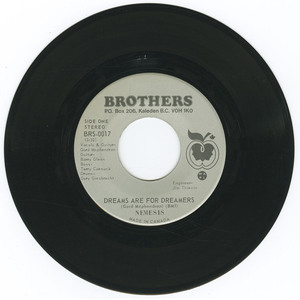 In 1973, Nemesis entered the studio to record two original tracks: “Dreams Are For Dreamers” (written by McPhedran), and the slightly more progressive “Quasar Connection” (co-written by McPhedran and Glenn). Both songs capture the warm, melodic tendencies of early '70s soft psych, blending acoustic textures, lush harmonies, and cosmic lyrical imagery. The single was issued on the private Brothers label (BRS-0017), engineered by Jim Thievin, and distributed locally in small quantities, making surviving copies highly sought after today by collectors of rare Canadian rock. Estimated value for clean originals now approaches $150.