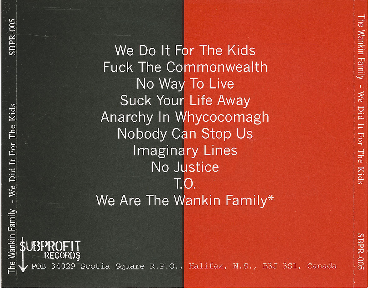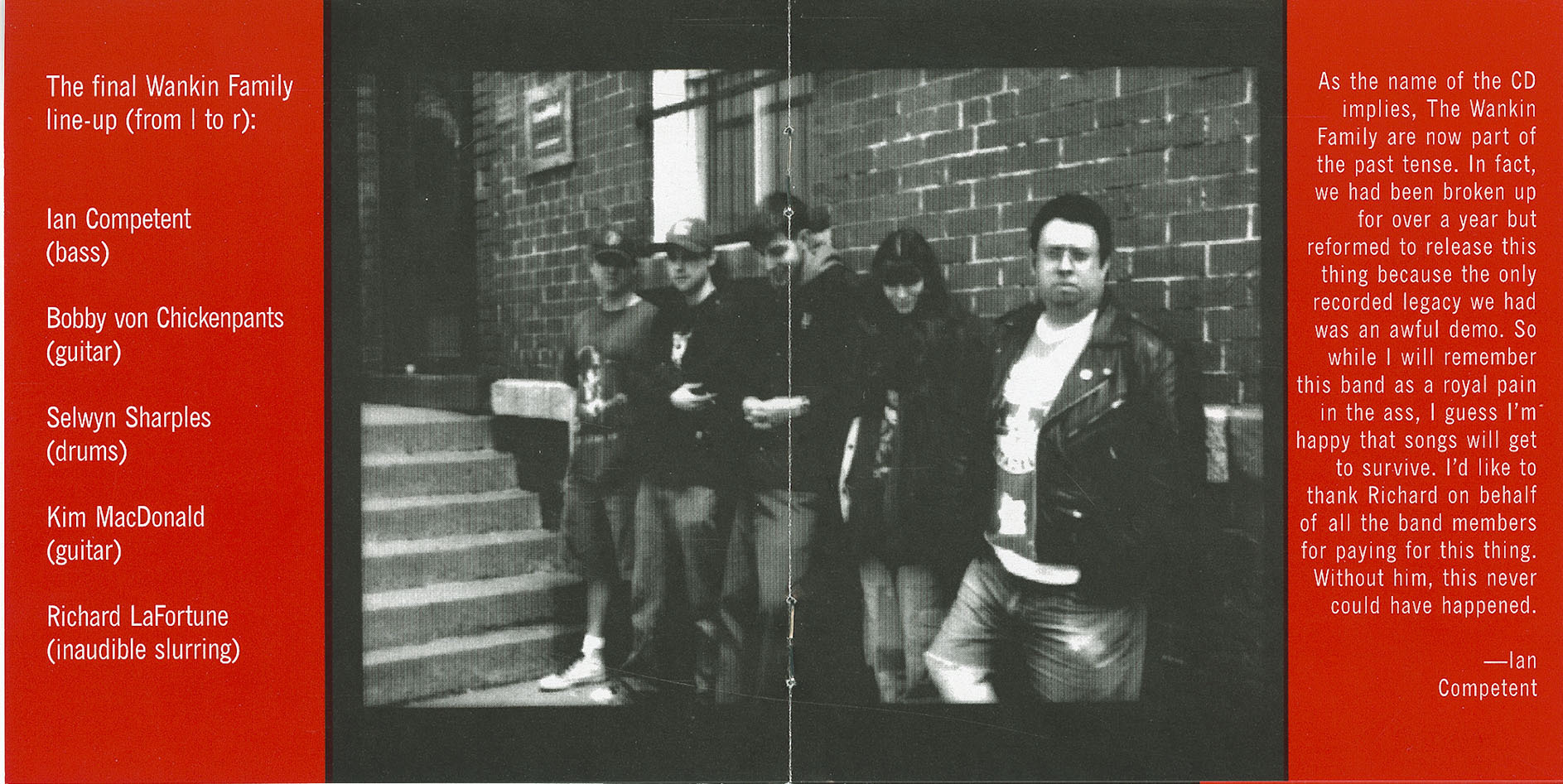 As the name of the CD implies, The Wankin Family are now part of the past tense. In fact, we had been broken up for over a year but reformed to release this thing because the only recorded legacy we had was an awful demo. So while I will remember this band as a royal pain in the ass, I guess I’m happy that songs will get to survive. I’d like to thank Richard on behalf of all the band members for paying for this thing. Without him, this never could have happened.