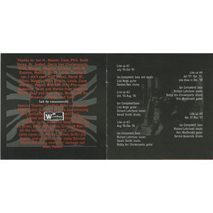 Special Thanks: Condon, Mike and Jackie, Steve Outhit (for his patience and amazing turd-polishing abilities), Lionel and Lamenté, Ray and Bad Luck #13, The New Breed (Jon S., Brian, Dave and Chris), Erin and Mac for all the work they did on this, Lisa Verge (who came up with our name), G-Oil!-ald Smith, and of course, our mate Derrick Generrick who’s now doin’ damage out west. Fanks!