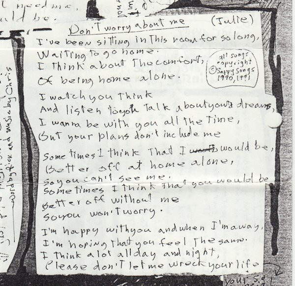 By December 1990 we had ten songs together and wanted to record a tape. Our friend Chris Donnahee was able to borrow a cassette 4track from his highschool and he came over to our space on December 2nd to help engineer the session. We had a couple sm57 mics, four borrowed cheap Realistic (Radioshack) mics and a little Realistic 6 channel mixer. The guitars, bass and drums were recorded live into the 4track with 3 mics on drums going through the mixer into one track. We got the 10 songs recorded that day, then in the next week we worked on adding the vocals.