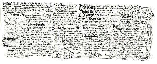All songs by Rick White except #7 which was recorded on cassette from the radio as we played live on air from the studio at CKUM in Moncton. NATASHA HEBERT was playing percussion with us. The song is a cover of "Feel a whole lot better" by the Byrds.