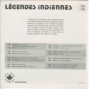 Final record of a record set on Radio Canada International F-685 to F-700. The other volumes in the series have tellings of legends of Canadian First Nations, dramatized by author Bernard Assiniwi. This is the only volume that has music.