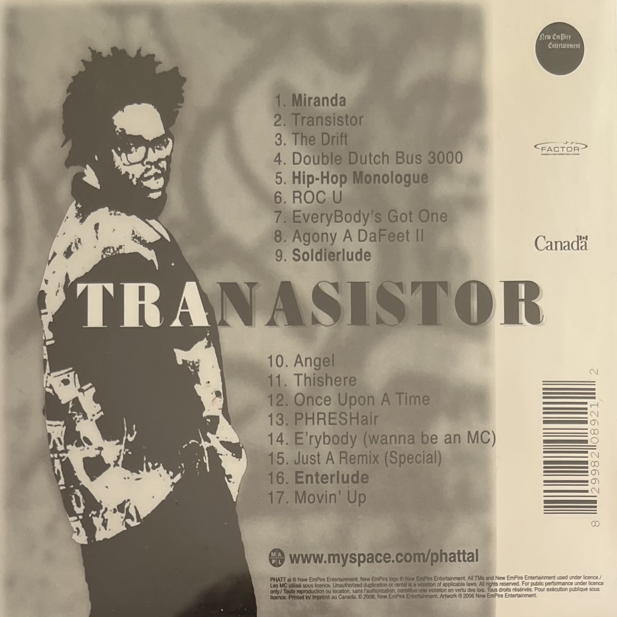 A longtime Toronto hip-hop fixture and MC collaborator with God Made Me Funky and The Quartertones, PHATT Al returns with a third release that takes advantage of his funk connections, with an emphasis on Clinton-style breakdowns. Transistor doesn't get too heavy or psychedelic, but bears the heady influence of Divine Styler -- abstract funkiness, unorthodox choruses, random voice distortion -- who lends his production skills to the leadoff title track. Al's veteran status is reflected in this fairly mature record; his greatest assets are his smooth flow, consistent sound and intelligent take on potentially tired subject matter (relationships, the problem with hip-hop). Though occasionally too laid-back, PHATT Al's got a sound that could rock a jazz festival or an open-mic night with equal zest.