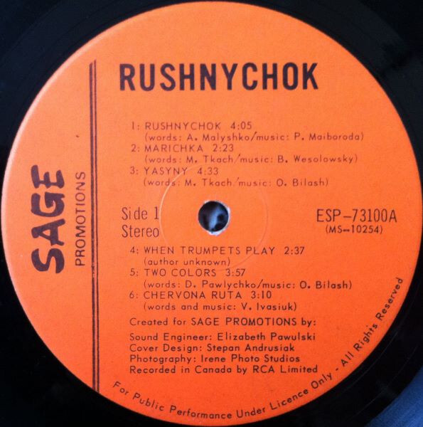 In their time together, Rushnychok recorded five albums comprised of 63 songs. The albums were all issued under the band's own SAGE Promotions record label (SAGE came from combining their names' first initials). The band's album sales could be counted in the tens of thousands - a rare feat compared to other North American "ethnic" acts. Amazingly, the albums also had a large impact in Ukraine where copies had to be secrectly snuck in.
