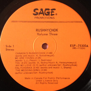 In their time together, Rushnychok recorded five albums comprised of 63 songs. The albums were all issued under the band's own SAGE Promotions record label (SAGE came from combining their names' first initials). The band's album sales could be counted in the tens of thousands - a rare feat compared to other North American "ethnic" acts. Amazingly, the albums also had a large impact in Ukraine where copies had to be secrectly snuck in.