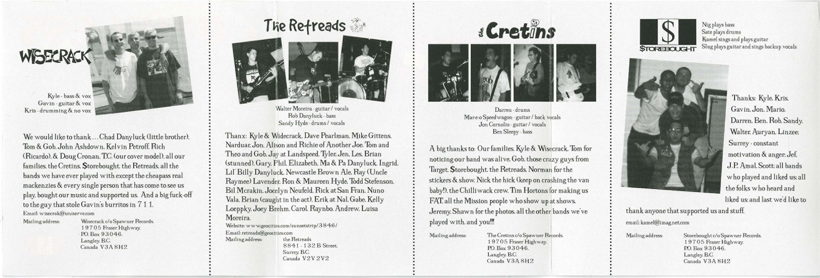 The four bands represented here are all from Langley or Surrey, and are, for the most part, pretty trad, Dad. Wisecrack are driving melodic hardcore that certainly wouldn't seem out of place on the Epitaph label. Strong vocals, beefy guitar (sometimes taking riffage cues from 80's Bay Area metal) and catchy changes are what this band is about. The Retreads are more of the same, but with a layer of grit and a more sing-a-long quality. Storebought take this a step further, and are a bit reckless, with English '77 type vocalisms thrown in for good measure. The Cretins, finally, are more, dare I say... gothic? They start with the same base as the other three bands, and then add Misfits-like "whoa-oh-whoa" harmonies to their aggressive power chords.