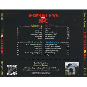 With Homeless in B.C., the first sampler from Wisecrack member Kyle Richardson's newborn label, Spawner, DIY has never been so well produced. The sound of these 24 recordings easily belie the fact they were recorded in Richardson's basement.