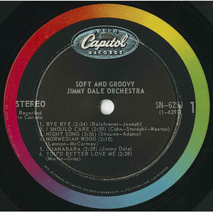 Groovy Canadian-only Capitol/CBC co-production instrumental LP featuring the talents of Guido Basso (trumpet), Ted Roderman, Rob McConnell (trombone), Jerry Toth, Moe Koffman, Eugene Amaro (flute & sax), Peter Appleyard (percussion), Ed Bickert, Jim Pirie, Sonny Greenidge, Lenny Breau (guitar), and Jimmy Dale (organ, leader, and arranger). Killer LP end-to-end with strong Brazilian and Beatles selections… Wow, great version of Milton Banana's "Cidade Vazia", you never see this! Great jazz bossa big band!