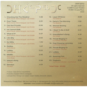 This CD has music of the Inuit in the Canadian Northwest Territories. You’ll hear songs varying from throat singing to lullabies. This CD was made possible by The Department of Indian and Northern Affairs (Canada), Calm Air, The Hamlet of Baker Lake.
