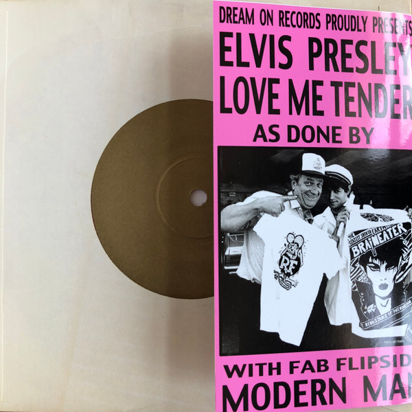Red vinyl 7" with gold labels in an unmarked sleeve. Some copies are signed in felt pen "I Braineater" or "Jim Cummins". Some have recently been sold with a photo of a painting done by I Braineater of Elvis.