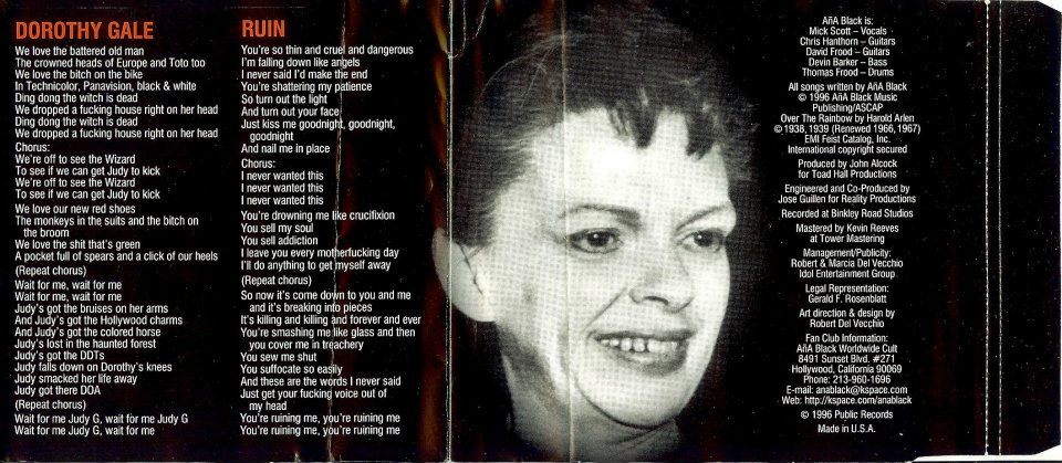 In the early 1990s Ana Black relocated to Los Angeles, hoping to break into the heart of the glam metal scene. They capped their output with the 1996 CD EP Dorothy Gale, released on Public Records, before disbanding later that year.