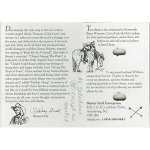 Dear friends, the title song of this my cowboy country gospel album “Seasons of Our Lives”, was written as I reflected on my life and it’s changes over the years, and dedicated to the memory of my mom and dad, Dolly and Lud Field. My friend and idol, world champion yodeller, Kenny Roberts, inspired the writing of “Help Me Be A Friend”, (the yodel is Kenny’s creation). “Chapel Among The Pines”, is indicative of all the little chapels I have visited thus far. “Gospel Yodel Song”, reflects my feelings of being alive and happy with the Lord. “Along The Trail of Tears”, I have written for my Native friends, and those dedicated to their well being. Most of the other gospel songs on this album were recorded by request and I added “Farther Along”, in memory of the late Roy Acuff. I have known so many people in my life, so it would be very difficult to name those whose friendship and love I treasure, but please know that you are all, ever, in my thoughts and prayers.
