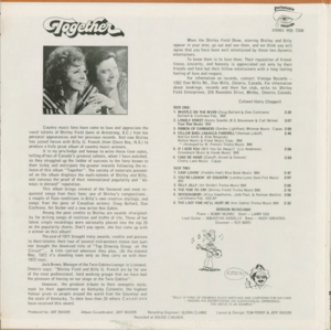In 1972, Shirley partnered with Nova Scotia-born singer Billy G. French for the duet LP Together (Periwinkle PER-7306 / Vintage SCV-115). The album showcased their chemistry across Canadian-penned material by Gordon Lightfoot, Doug Ballard, Don Cochrane, and Art Snider, alongside popular Nashville hits of the day. The pair toured widely as “The Shirley Field Show,” earning the Entertainers of the Year in Canada award in 1971 and consistently selling out theatres and lounges across Ontario.