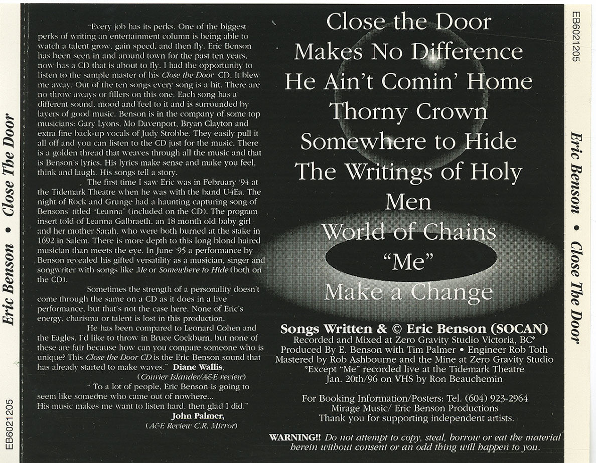 Shortly after its release in 1997, Eric Benson’s first CD “Close the Door”, gained accolades from veterans in the music world, and received airplay on FM, college radio and AM stations here in BC, and on budding internet radio stations and music sites worldwide. The “Door” is actually a window into the soul of this gifted artist. Eric is known for his ability to put pure emotions onto paper, and capture an audience within the songs striking melodies, and his soothing vocals. He has shared the stage with music icons Amanda Marshall, Ian Tyson, Juice Newton, Valdy, Queen of slide guitars Ellen McIllwain, and Roy Clark, to name a few.