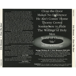 Eric Benson's 'Close The Door' CD is a must-have for any music lover. Featuring 10 tracks of soulful R&B, this album showcases Eric Benson's smooth vocals and powerful songwriting skills. From the catchy hooks of 'Don't Say Goodbye' to the intoxicating beat of 'Body Talk', every song on this album is sure to leave you grooving. Produced by industry heavyweights, 'Close The Door' has been crafted to perfection with every detail in mind. So, whether you're a fan of classic R&B or are just looking for a new addition to your music collection, Eric Benson's 'Close The Door' CD is sure to satisfy.