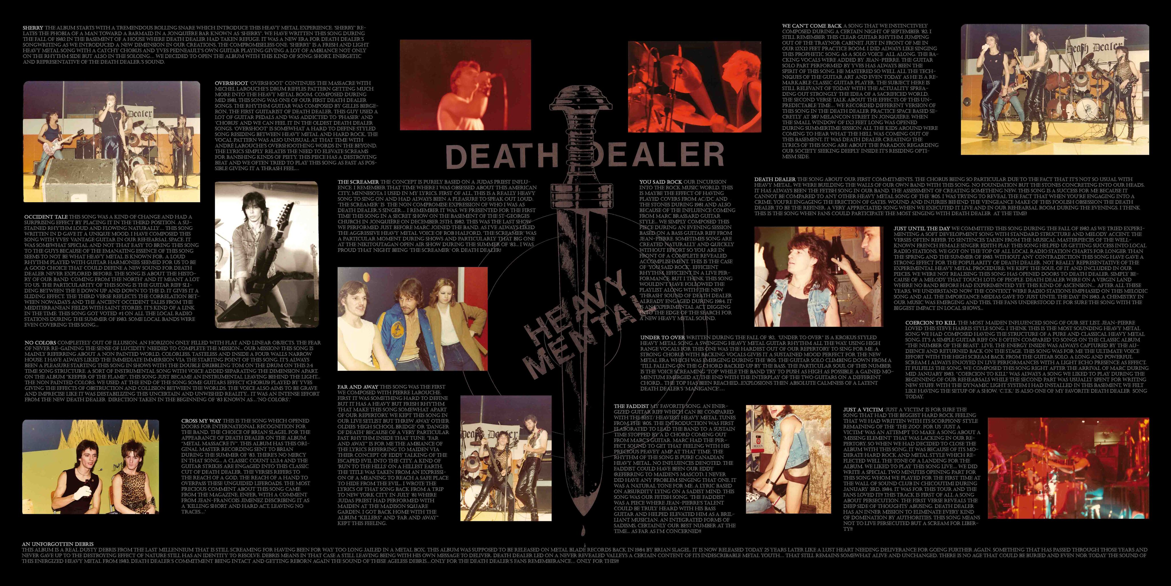 This special double LP album, “IV SIDES OFF”, is kind of an anthology referring to those wonderful years from 1981 until mid 1984. We did play so many shows and events which all derived into the production of this immortal demo/ album. On a winter weekend, we recorded it at the University of Quebec in Chicoutimi (UQAC) as an experimental trilogy project. The side IV of the album includes 5 never released songs from the band recorded in the baseman of St. Mary's church in Jonquière, were we had practiced locally at that time. It was recorded just before Gilles Bergeron had left the band in July. The song 'Show me your Ace' was first named 'Pearl Harbor' when we composed it. That year, Death Dealer was creating music that led to a new and original heavy metal sound.