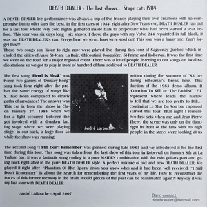 The ‘B’ side is the newcoming song ‘I still don’t remember’ composed in the late 1983 and that we presented for the first time in this tour. The text was at the final revision so an inversion of was we can say’ I don’t still’ instead of ‘I still don't 'occurs in this version played during the show. This song was taken from the last show of this tour in Roberval the January 08 at ‘La Turlute’. It was a fantastic song with its solo part ending by a pure Maiden combination of the two Guitars and remaining right after in the real Death Dealer style. A perfect mixture of old and new DD sound. Even for the first time playing, fans immediately adore this song. We played this song right after ‘Phantom of the opera’ from Maiden and it has been well received. I still don’t remember is the search for the remembering of the first years of my life. How to reconstruct the traces of this formatting memory in the brain. Should pieces of the past could be reanimated again! And after so many tries ‘I still don’t remember’…But only for the past of Death Dealer!!!