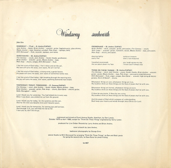 Highly talented Canadian male/female outfit whose custom album excels at a progressive hippie folk-rock style worthy of labels like Flying Fish or Rounder. Just a glance over the instruments in the credits - fiddle, banjo, cello, mandolin, dulcimer, flute, recorder - and you can tell these people are gonna be on the folksy side. All that plus the usual components (acoustic and electric guitars, bass, drums, piano, organ), plus a few “huh?” items (Hawaiian windbell, lapslaps, glass chimes, fogelschwantz, over-tones). Musically they’re quite diverse, including some Scots-Irish folk influences on ‘Promenade’, ‘Coming In The Clouds’, the Richard Thompson-ish ‘You’ve Given Yourself’ and the instrumental title track. ‘Over Waves’, ‘Yesterday, Today, Forever’ and ‘Think On These Things’ are all lovely acoustic ballads with female vocals (the latter also includes a jazzy flute and electric guitar interlude). Blues and bluegrass are sampled for Love Song’s ‘Front Seat Back Seat’, the album’s only cover tune (although three songs are noted as having been adapted from traditional melodies). Moving electric guitar and pedal steel solos embrace ‘Stone To Gold’, a graceful country rock excursion ala The Eagles or America. ‘Lover And Friend’ is a strong nearly eight-minute progressive track that begins as a piano ballad before building to a harder rock edge that includes beautiful use of electric violin. From St. Catharines, Ontario. Attractive tree cover painting. A really great record - some of the most skillful, creative and artistic folk sounds I’ve heard.