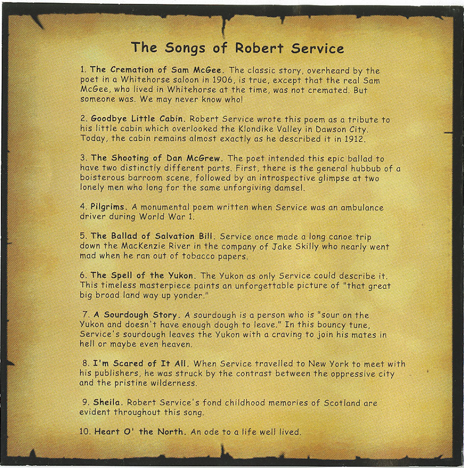 Another musical offering is "The Songs of Robert Service", a CD featuring ten poems by the famous poet, set to contemporary music. Robert Service was the subject again in one of a series of hour-long recordings created for the Yukon tourist market, including "Colourful Characters of the Klondike", "North to Alaska on the Trail of '42", "The Northwest Mounted Police in the Klondike", and "The Robert Service Story".