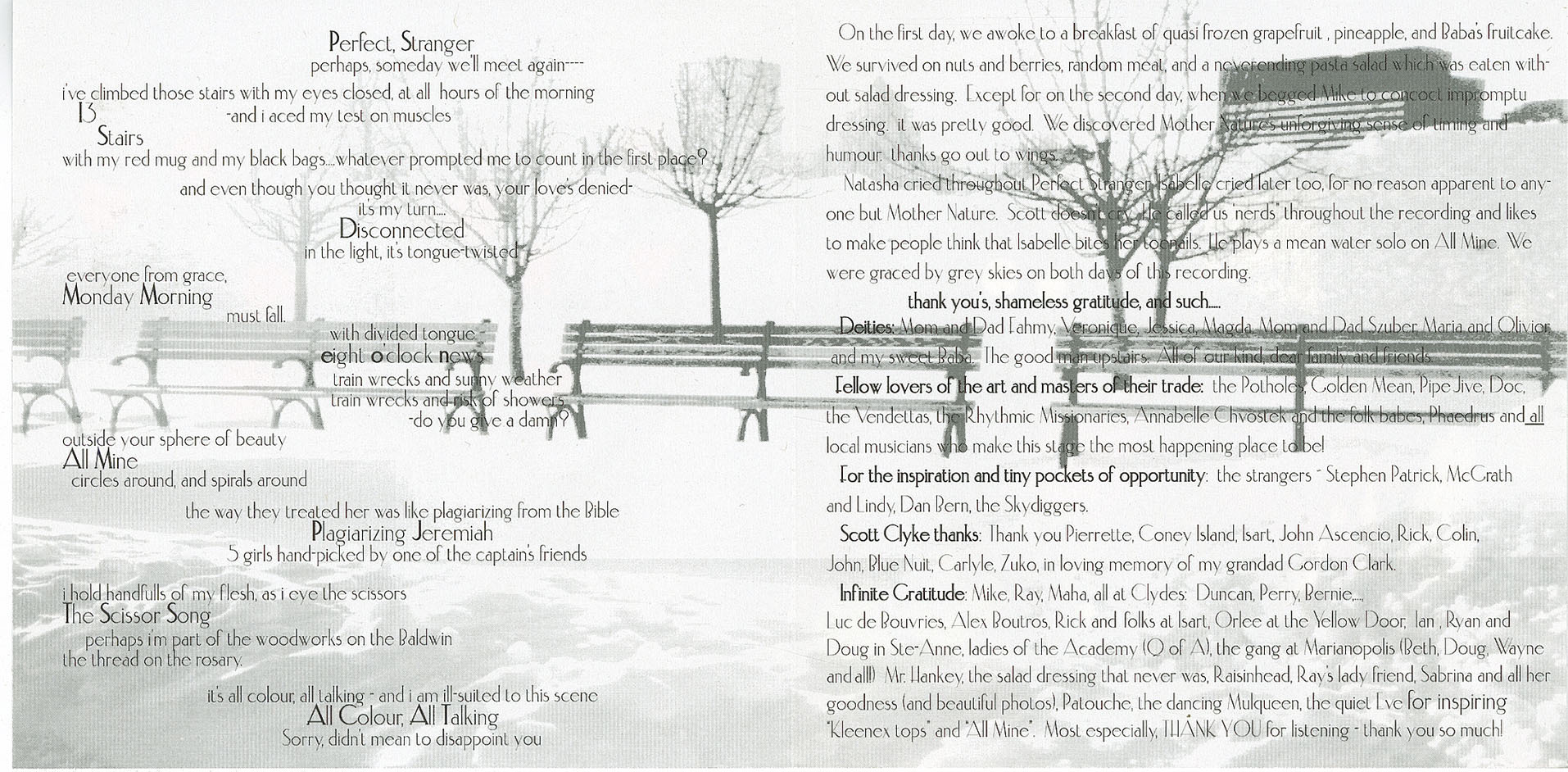 Luc de Bouvires, Alex Boutros, Rick and folks at Isart, Orlee at the Yellow Door, Ian, Ryan and Doug in Ste-Anne, ladies of the Academy (Q of A), the gang at Marianopolis (Beth, Doug, Wayne and all!) Mr. Hankey, the salad dressing that never was, Raisinhead, Rav’s lady friend, Sabrina and all her goodness (and beautiful photos), Patouche, the dancing Mulqueen, the quiet I’ve for inspiring “Kleenex tops” and All Mine. Most especially, THANK YOU for listening - thank you so much!
