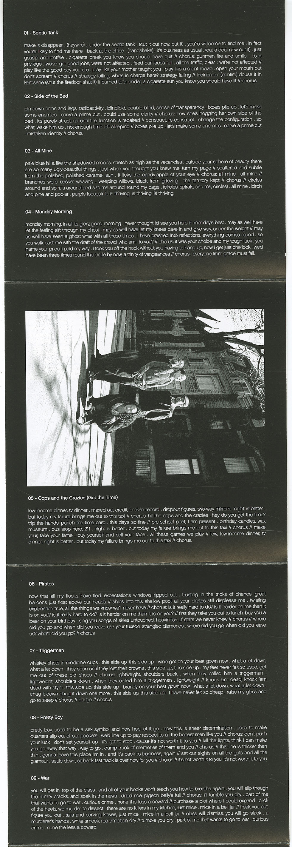 we dance the line I think we dance the line // if we are magnets of similar poles . then what was yesterday’s danger, is today’s reservation . spitting seeds on the tired ground . and all of the chrysanthemums crow out loud // chorus: shoulder blade is in my hand . and every spade I play turns crooked . still taste you on the silverware // learn the names of all the plastic flowers, fix for a junkie . clumsy butterflies, never asked to conquer, every corner and many would have bargained for this rank, and I would never bargain for this // chorus // compass spinning, can’t open wide for the airplane . just do something // I wished and I wished til I try, til my back was broken, my spine was bent (we dance the line I think we dance the line) . smile and I smile over, whitewash over . hairline fracture, ego like a deadweight (we dance the line I think we dance the line) . and many would have bargained for this // we dance the line I think we dance the line, we dance, the line.