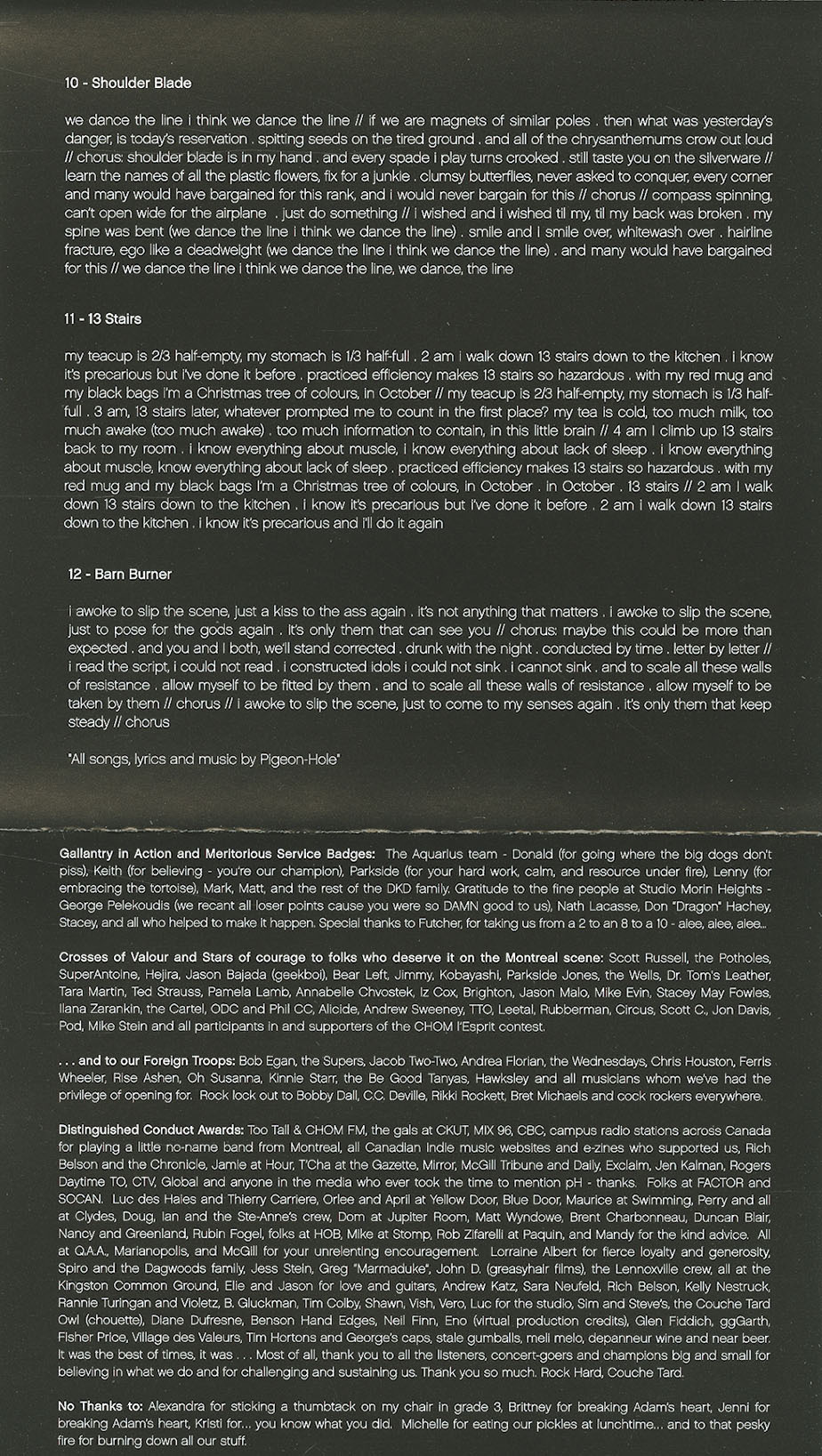 Too Tall & CHOM FM, the gals at CKUT, MIX 96, CBC, campus radio stations across Canada for playing a little too much Pigeon-Hole, all Canadian Indie music websites and e-zines who supported us, Rich Belson and the Chronicle, Jamie at Hour, T’Cha at the Gazette, Mirror, McGill Tribune and Daily, Exclaim, Jen Kalman, Rogers Daytime TV, City TV, Global and anyone in the media who were too thick to mention and a big thanks: Folks at FACTOR, Bill SOCAN, Luc des Hales and Thierry Carrier, Orlé and April at Yellow Door, Blue Door, Maurice at Swimming, Perry and all at Clydes, Doug and the St-Anne’s Office, Dom at Jupiter Room, Matt Wodling, Brent Charbonneau, Duncan Blair, Nancy and Greenland, Rubin Fogel, folks at HOB, Mike at Stomp, Rob Ziffarelli at Paquin, and Mandy for the advanced. All at QAA, Marianopolis, and McGill for your encouragement. Lorraine Albert and her merry band of wackos, Eric Spiro and the Dagwoods family, Jess Stein for “Marmaduke,” John B (greasyhair films), the Lennoxville crew, all at the Kingston Common Ground, Elie and Andrew Swan, Adrien Katz, Sara Neufeld, Rich Belson, Kelly Nestruck, Fannie Turignan and VioletZ, B. Gluckman, Tim Colby, Shawn Fish, Vero, Luc for the studio, and Steve’s The Cuches Tard (for those who don’t know us). Benson Hotel and Neil’s twins, Enlo (virtual production credits), Glenn Fidditch, dgGarth, Fisher Price, Village des Valeurs, Tim Hortons and George’s, caps staples, melini melini melini, and beer because it was the best of times, it was… Most of all, thank you to all the listeners, concert-goers and champions big and small for believing in what we do and for celebrating and sustaining us. Thank you. Rock Hard, Rock Cute.