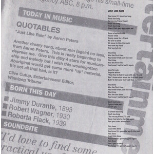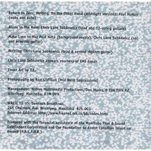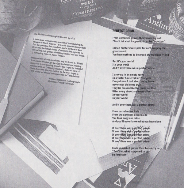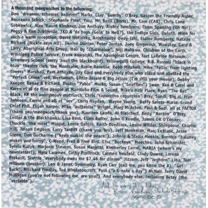 Don "dreamer, schemer, believer" Marks, Clay "Gumby" O'Bray, Gasper the Friendly Asper, Roseanna Schick, Stephanie Pinel, Yazz, Mr. Basil (Boris), Mr. Cam (CAK), Chris Lane Sobkowicz, Alex "Kount Kirshner," Jon Anchovy, Richie Sombrero, Thom Sparling (Oh No!), Peggy & Ron Jubinville, TKO & da boys (Goin' to Hell), the Indigo Girls, Duluth, Minn for such a warm reception, David Wolinsky, Anishinaabe Oway-Ishi, Elaine Bomberry, Natalie Richard (Nicole says Hi!), Denise Donlon, Peter Jordan, Joey Gregorash, Wawatay, Gord & Larry, Aboriginal Arts Group, Hair by "Charmaine", Niji Mahkwa, Children of the Earth, Winnipeg Police Service, Frank Kowalski, The Aboriginal Centre, Fort LaReine Museum, Greenway School (sorry 'bout the blackboard), Yellowquill College, R.B. Russell "black 'n blue" theatre club, the Montcalm, Roxie Ranville, Robb Mitchell, Mike "fallin' from lighting towers" Marshall, Pam Athayde, Jay Gard and everybody else who aided and abetted the "Perfect Crime": Reid, Weedatam, Little Jessie & Big Jessie (I'm still your mouse), Debby Keeper, Renee & Richard, Dustin "Pablo" Marks, Susan ("Snuffles") Swan, Kev & Carol and Karen et al the fine people at Manitoba Film & Sound, Mike's Hair Place, Ryan "The Raz" Black, KT the anonymous anti-matricarch, Chris "cappuccino capuccino" Bray, Sandi Big AJ, Fran Johnson, Carrie and all at "sev", Chris Hayden, Wayne Young, Buffy Sainte-Marie, Grand Chief Phil, Elijah Harper, Mike "outtasite" Wright, Marc McCarton, Paul & Suzi, all at FACTOR (thank you/meegwetch/thank you), Maureen Landa, Al Bleichert, Kelly "Norton" O'Bray, Lester & the Blackhawks, Lisa Best, Ellen Rutter, John O'Kendle, James OK O'Connor, Chuckie "the most" Molgat, Lorne Dahlin, Keith Dzedzora, Leslie Wider, Shingoose, Charlie Hill, Jason Empson, Larry Tardiff (thanks too), Jeff Morrison, Marc Leiberman, Basil Green, Don Ducharme ("keep makin' the peace"), Johnnie & Stella Meeks, Bernice "baloney flakes no turkey" C-Weed, Peggy & Leslie, Richard Mulligan, Kevin Schick, Sylvia Kuzyk, Marjorie Stevens, Susan Marjett, Kimberley Carrol, MARIA (where's my newsletter?), Myra Lazare, Cathy Preibisch, Carmen Neufeld, Jeff Didora, Anne-Marie Prakaski, Scottie "everybody owes me $7.66 for dinner" Jizzum, Jeff "leghorn" Liba, Tom Mulligan (you're not following me, are you?), and everybody else, including Betsy (the 'vertable').