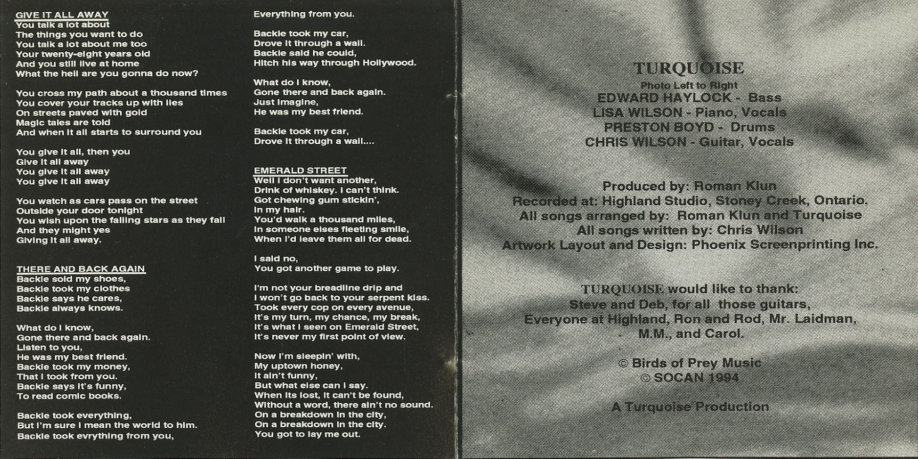 Recorded at Highland Studio, Stoney Creek, Ontario