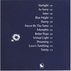 STARLIGHT • starlight starbright • first star i see tonight • take me home • i feel so alone • good times bad times • bring on the high tides • i’ve found • peace on my own • yeah i know • you’re tired of being told • take me home • home sweet home • red light green light • caught on the right side • of hope • left side unknown • yeah i know • it will soon all unfold • five thousand light years • since i have been here • nobody’s listening • i’ve done my time • i’m coming home • SO SORRY • we make our home on a crowded earth • we’re not alone we share the birth • we’ve found look around • i can’t believe it got this far • as i look helpless to the stars • in shame we’re to blame • i think this time we’ve realized • we’ve looked ahead with open eyes • we’re so sorry we’re so sorry • it’s time to leave the past behind • head on to the other side • all we’ve done and all i’ve seen • i’m surprised we still see green • at all we’ll learn to crawl • i think it’s time we realized • and looked ahead with open eyes • we’re so sorry we’re so sorry • it’s time to leave the past behind • head on to the other side • we’re so sorry we’re so sorry • it’s time to give it one more try • break on thru the other side • you say the view from here is pretty • thru my eyes i just can’t tell • thru the clouds i see the city • is it nature’s bid farewell farewell farewell • i think this time we realize • we look ahead with open eyes • BLUE NIGHT • a red light cuts the darkness on a downtown boulevard • blinking like a beacon • calling out in the dark • running from the daylight • to the blue of the night • taken by the fall • the blue blue blue blue night • a new life • blue blue night • we are again • with your back against the wall • blue blue blue night • children of the night • are watching shadows on the wall • their innocence misguided by the wonder of it all • the glitter of the city • they are again • with their backs against the wall • blue blue night • seen it all before • trying to run before you crawl • blue blue blue night • SHERRY • my first love • back in ’79 • like a dream • the summer spiraled by • how i long • for those endless nights • in your arms • all of the highs we shared • the rest of our lives to spare • all of those nights • we danced to madame blue • ooh sherry sherry • we lived thru rainbow colored eyes • wish i knew • your kiss would stand the test of time • sherry sherry • i don’t know why you said goodbye • and why did you cry • sherry why did you say goodbye • now my love • is just a memory • but we’ll be • forever in our dreams • years go by • those days are still alive • life goes on • just one of those dreams you share • i remember the times we said • we’d spend our lives • together forever and ever • NEVER BE THE SAME • just like the picture on a movie screen • larger than life still all the details are seen • if life’s a play you know your entrance was grand • my eyes fell on you girl as if by command • my life’s been completed • don’t let me down • don’t let me down • because life without you • would never be the same • without you • the world surrounds you • so glad that i’ve found you • i’ll never be the same • i’ve climbed every mountain and i’ve swam every sea • i’ve held out my heart for the whole world to see • if the moon and sun were all that i had • i’d give them to you just so you’d understand • my life’s been completed • don’t let me down • don’t let me down • because life without you • would never be the same • without you • the world surrounds you • so glad that i’ve found you • i’ll never be the same • MEMPHIS • memphis • the fall of a star • its faded light takes you near and far • all say those who were enlightened • strange is the power • that’s what it’s like a rainbow • i wanna go • when the day breaks into morning and the sun strokes close my eyes • i will shift my gears in motion • as i rev up to the red line • i wanna go • so i’ll hit the road • i’m off to memphis tennessee • down by the crossroads • that’s where i’ll be • see a new horizon • between truth and what’s being told • when their hearts no longer guide them • there’s a place where they all go • they’ll hit the road • it’s their ambition • they’ve turned it on • to an obsession • i hear the call • no longer waiting • i’ll hit the road coz i wanna go • BETTER DAYS • i know it sounds crazy but i just can’t stand the pain • my lover’s loved by others • and it’s driving me insane • i’ve seen better days • must be a better way • i’ll find better days without you • my concentration falls with you • my work’s gone down the drain • i look around and tell myself • it’s just another day • here do as you’d have done to you • LIFE isn’t all that you chose • wasting my time here with you • i think i’ll be fine without you • nothing comes easy • think i’d rather be alone • i’m tired of sitting • waiting for the ringing of the phone • VIRTUAL LIGHT • has there ever been a day • when life was life • and love was love • and you had all you wanted • has there ever been a day • tune in turn on • nothing else matters • tune in turn on • yes i hope there’ll be a day • when peace will reign upon us • i hope to see the day • if you feel the need • to know what’s right • searching for the shining light • to guide you • i think you’ve lost your way • tune in turn on • nothing else matters • tune in turn on • like a blue sky • and the light that shines on everything • if you 