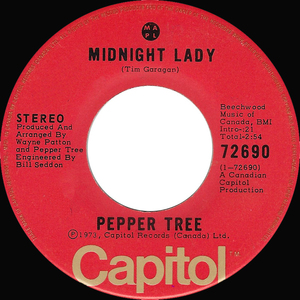 Released in February 1973, this was Pepper Tree’s sixth single, and the first to be fully credited as produced and arranged by the band themselves in collaboration with Wayne Patton. Both tracks are non-album recordings: “Midnight Lady” was composed by Tim Garagan, and “Teach Me How To Fly” by Bob Quinn, reflecting the band's continued creative output during their final phase under Capitol.