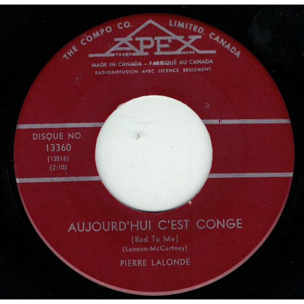 Lalonde, Pierre - Aujourd'hui C'est Congé (Bad To Me) b/w Un Je Ne Sais Quoi