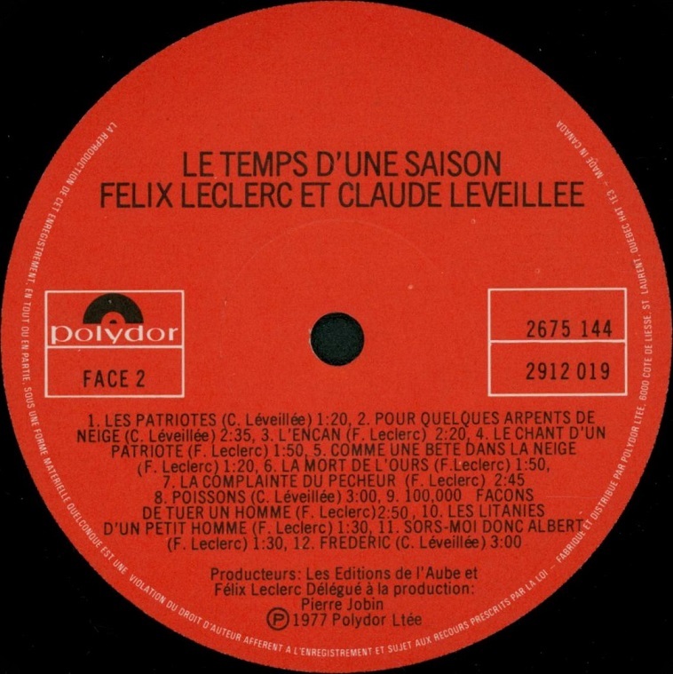 Léveillée, Claude - Le temps d'une saison (et Félix Leclerc) (2 LP)