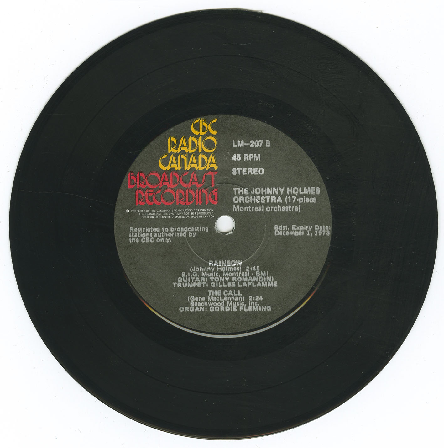 After retiring from music in 1951, Holmes returned in 1959 to front orchestras for CBC Radio. Throughout the 1960s he was heard regularly on programs like The Johnny Holmes Show and Broadway Holiday, blending Broadway sparkle, light music, and jazz into a polished orchestral style. Between 1966 and 1973 he recorded a total of six broadcast-only albums and singles for the CBC’s LM (Light Music) series. These were pressed in tiny quantities and distributed in plain stock sleeves, never sold commercially. Among them were two sought-after LPs — Johnny Holmes Orchestra – Ray Berthiaume and Margo McKinnon, vocalists (CBC LM-16, 1966) and Johnny Holmes Orchestra – Ray Berthiaume, vocalist (CBC LM-29, 1967). He then experimented with a brass-heavy ensemble under the name Brass Therapy, recording CBC LM-164 (1971, released 1973) with “Close to You,” “So Nice,” “Wave,” and “Lollipops and Roses,” and CBC LM-192 (1972), featuring For Once in My Life (arranged by Holmes), Love Story (trombone feature for Claude Blouin), Watch What Happens (guitar feature for Tony Romandini), and Lonely Is the Name. In 1972 Holmes also cut CBC LM-207, a 45 pairing Gordon Lightfoot’s “If You Could Read My Mind” and Gene MacLellan’s “Put Your Hand in the Hand” with his own composition “Rainbow” and MacLellan’s “The Call.” His final entry came with CBC LM-266 (1973), a 45 featuring “Si tu parais” and “Alouette.”