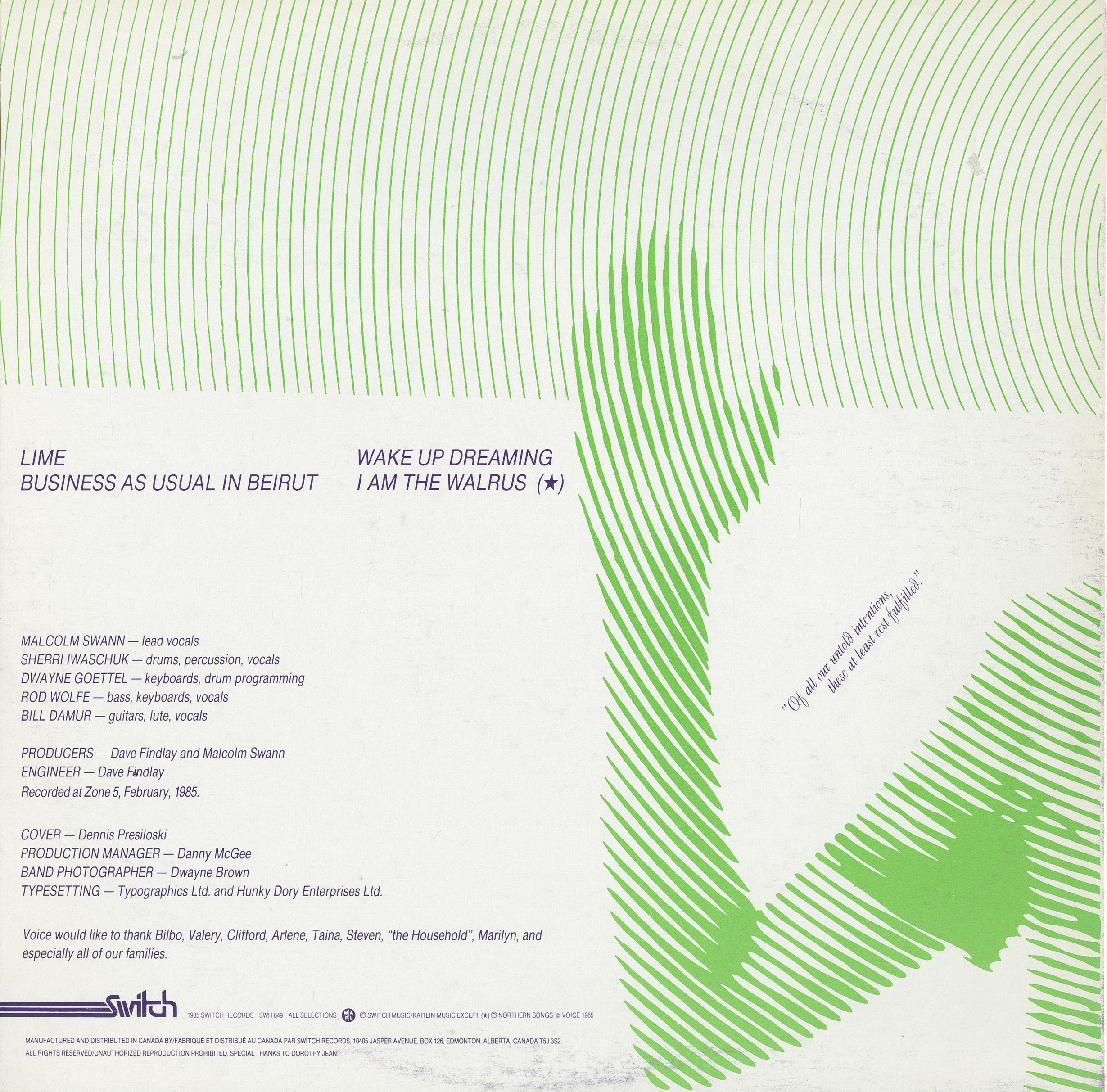 The record featured four tracks: Lime, Business As Usual in Beirut, Wake Up Dreaming, and a driving electronic cover of I Am the Walrus. The songs, mostly co-written by Swann, Goettel, Damur, and Wolfe, combined mechanical precision with emotional immediacy, characteristic of mid-1980s Canadian synthpop. Findlay and Swann produced, with a striking sleeve design by Dennis Presiloski, photography by Dwayne Brown.