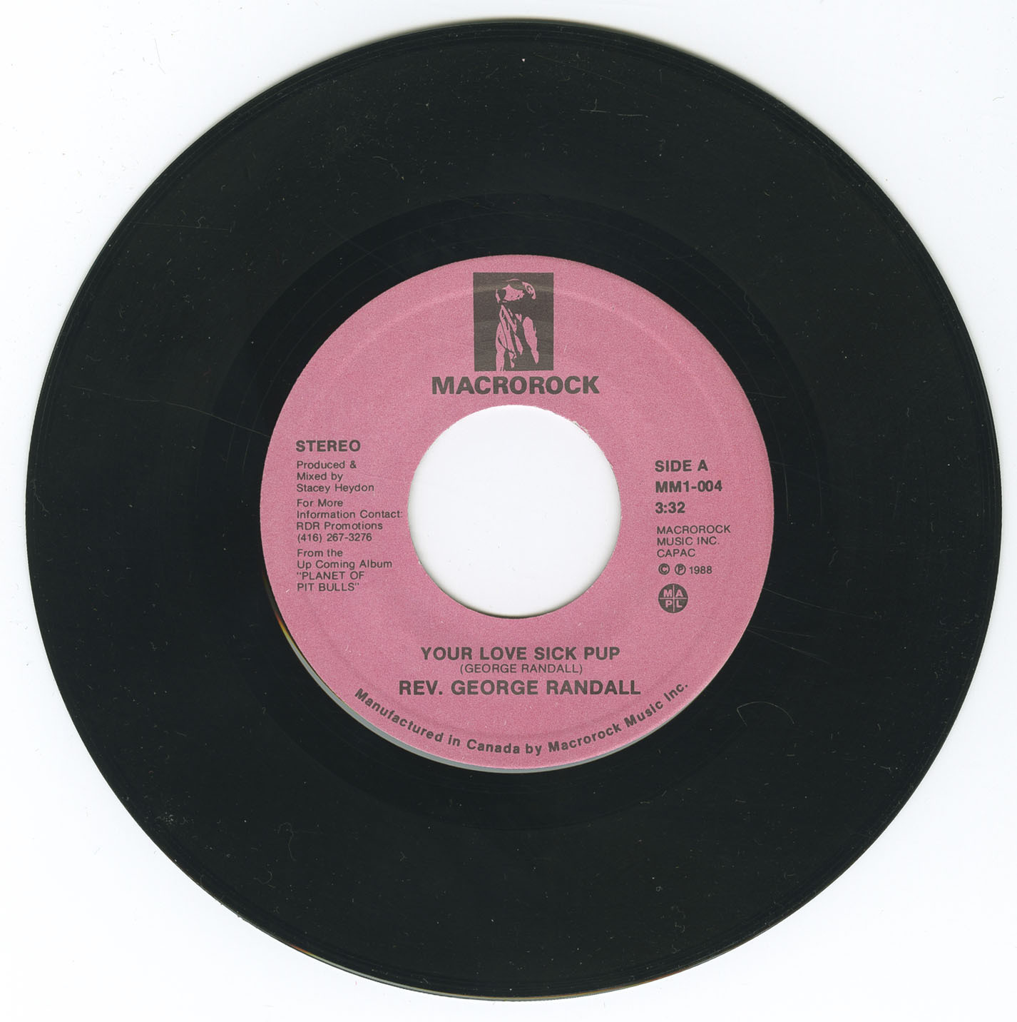 George Randall is a Canadian singer-songwriter and independent rock artist born in Winnipeg, Manitoba, and raised in London, Ontario. Emerging from the city’s thriving late-1980s studio scene, Randall recorded a small but distinctive body of work that reflected the DIY ethos of the era and the growing sophistication of London’s recording community. Working through his own label, Macrorock Music Inc., Randall wrote, performed, and co-produced a series of independently released 45s that combined humor, social satire, and tightly arranged rock musicianship. His debut single, I’ll Be a Pit Bull for Your Love b/w 1000 Radio Stations (1987), was recorded live at Recording Studio 107 and EMAC Recording Studios, engineered by Paul Venesoen with assistance from EMAC co-founder Rob Nation—both established figures in London’s recording scene who, along with Joe Vaughan, had built EMAC into a creative hub since its founding in 1979. The single featured guitarist Peter Schaefer, bassist John Chryssoulakis, drummer Jeff Stevens, and keyboardist Patrick Dubois, with backing vocals by Jane Colligan and Lorraine Murray.