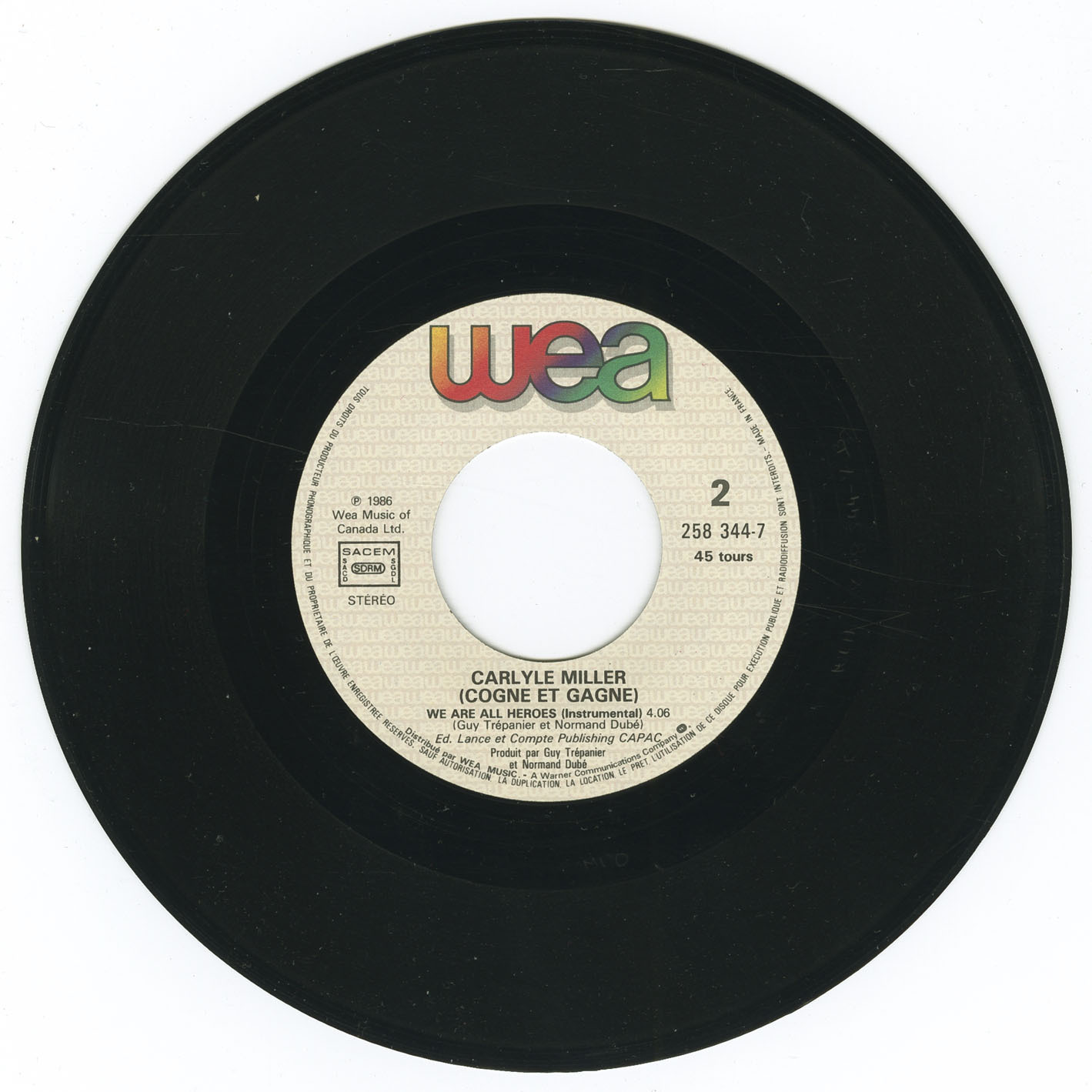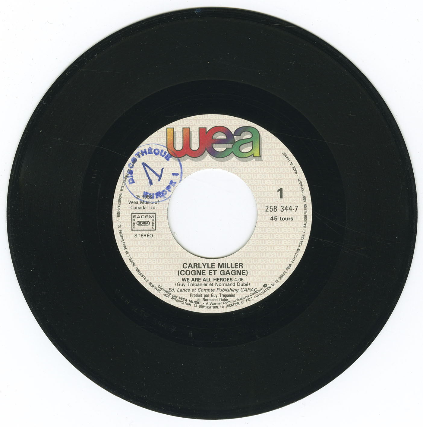 Miller’s later success arrived unexpectedly in the world of television drama, where his stirring performance of “We Are All Heroes” became the theme song for the wildly popular Québec hockey series Lance et compte. Released first in 1986 on a split 7-inch with Nathalie Carsen and then in 1987 as a standalone French-market single under the title “Cogne et gagne,” the track captured the emotional tone of the series and introduced his voice to a new, province-wide audience. The song’s anthemic quality and Miller’s passionate delivery ensure it remains one of the most memorable Québec TV themes of the decade.