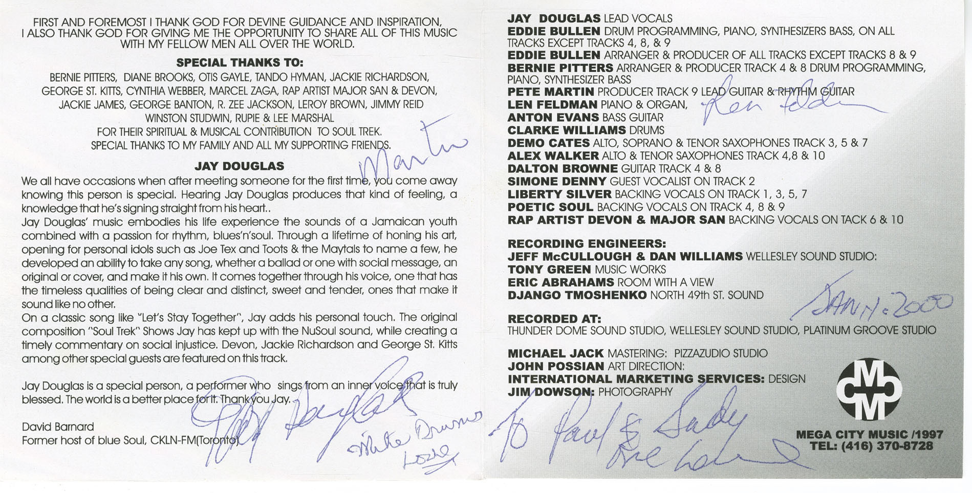 Bernie Pitters, Diane Brooks, Otis Gayle, Tando Hyman, Jackie Richardson, George St. Kitts, Cynthia Webber, Marcel Zaga, Rap Artist Major San & Devon, Jackie James, George Banton, R. Zee Jackson, Leroy Brown, Jimmy Reid, Winston Studmi, Rupie & Lee Marshal For their spiritual & musical contribution to Soul Trek