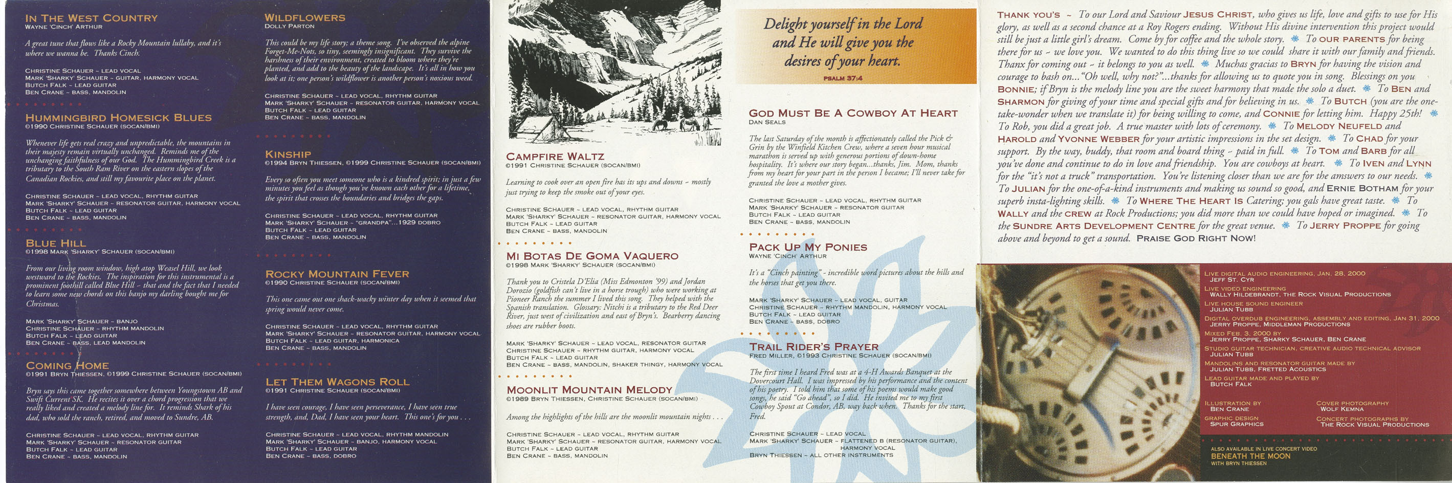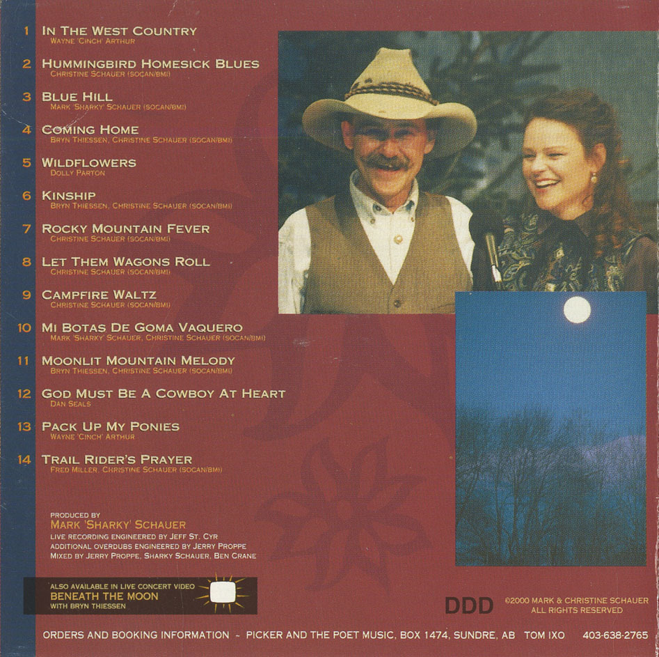 Mark “Sharky” Schauer and Christine Schauer are part of the West Country music tradition that runs through Sundre, Alberta—an area shaped by foothill ranching, cowboy poetry, and small-town gatherings where songs travel from one campfire to the next. Their writing springs directly from that landscape: Weasel Hill, Hummingbird Creek, the Ram River country, and the community of ranch families and musicians who anchor the region. Moonlit Mountain Melodies (2000) reflects those ties, with contributions from close collaborators Butch Falk, Ben Crane, and Bryn Thiessen, and with a special nod to Wayne “Cinch” Arthur, one of the area’s most respected cowboy storytellers and songwriters. The Schauers include two of his compositions—“In the West Country” and “Pack Up My Ponies”—songs Arthur first recorded himself during his Sundre years, including his own version of “In the West Country” on his 1976 LP Alberta Gold. By bringing those songs into their repertoire, Sharky and Chris place themselves squarely within the living, passing-hand-to-hand tradition of Cowboy Trail music, where local stories move between generations and settle into new voices. https://citizenfreak.com/titles/265762-arthur-wayne-cinch-alberta-gold