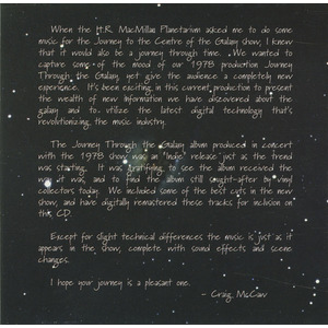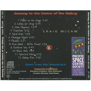 The music on Journey to the Centre of the Galaxy was composed for the H.R. MacMillan Planetarium’s production of the same name. Craig McCaw approached the project as both a continuation and a reinterpretation of the original 1978 planetarium presentation Journey Through the Galaxy, seeking to preserve its atmosphere while presenting a completely new experience for audiences.