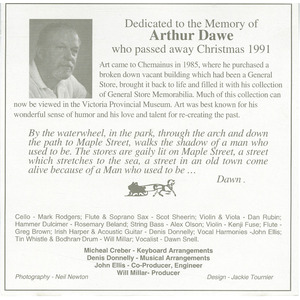 Art came to Chemainus in 1985, where he purchased a broken down vacant building which had been a General Store, brought it back to life and filled it with his collection of General Store Memorabilia. Much of this collection can now be viewed in the Victoria Provincial Museum. Art was best known for his wonderful sense of humor and his love and talent for re-creating the past.