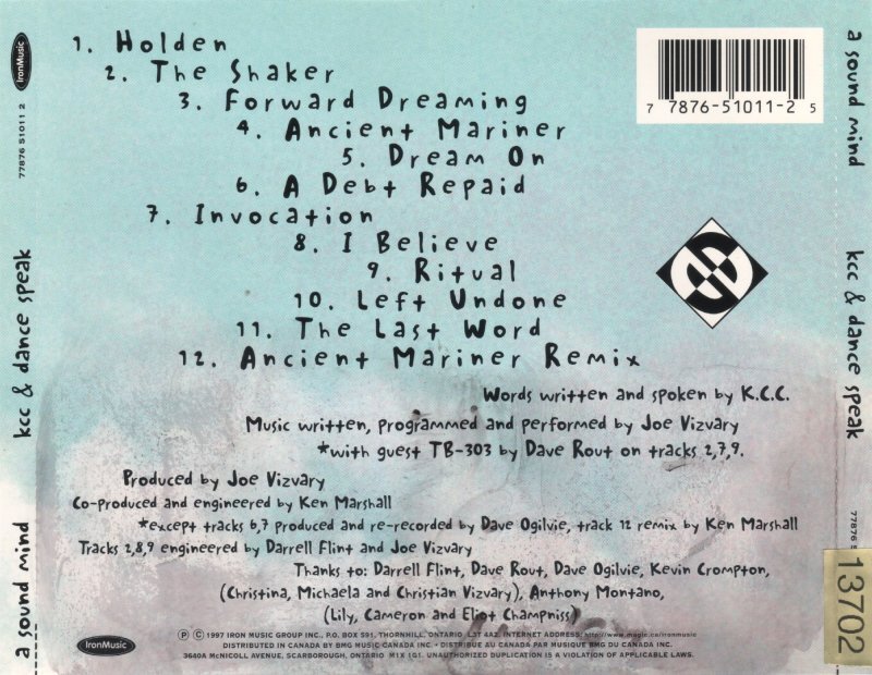 By the mid-1990s, the Dancespeak identity evolved further with the release of A Sound Mind on Iron Music. The album expanded the project into a more fully realized electronic statement, with Joe Vizvary handling music, programming, and performance, Champniss focusing on spoken-word and lyrical content, and contributions from figures such as Dave Rout on TB-303. Its layered production credits—spanning Ken Marshall, Dave Ogilvie, and Darrell Flint—reflect the collaborative, studio-driven character of Vancouver’s electronic scene during the period.