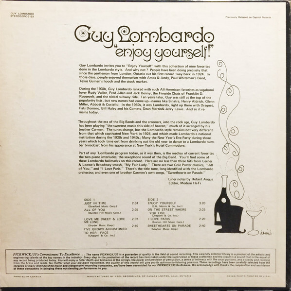 Throughout the 1930s and 1940s, the Royal Canadians recorded prolifically and scored numerous hits, including “Seems Like Old Times,” “Blue Skies,” “Moonlight Serenade,” “Harbor Lights,” and “Enjoy Yourself (It’s Later Than You Think).” Lombardo’s approach emphasized strict tempos, lush reed sections, and meticulous arrangements—often credited to his brother Carmen—creating a recognizable “sweet band” sound that stood in contrast to swing-era jazz orchestras led by figures such as Benny Goodman or Count Basie.