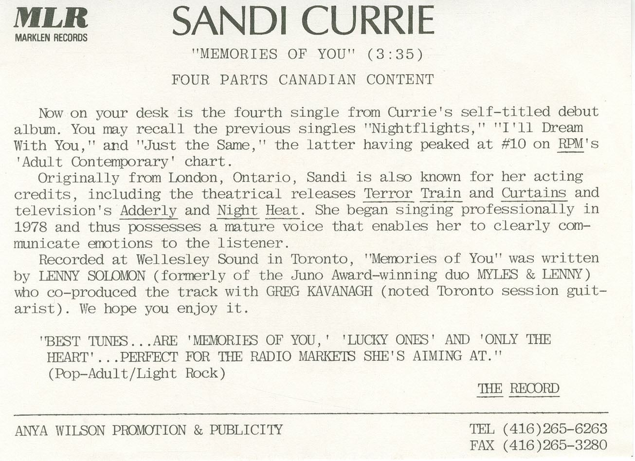 Her recording career emerged in the late 1980s through Toronto’s studio scene. Currie released a self-titled debut album in 1987 on Marklen Records (MLR), supported by a series of singles including “Night Flights,” “I’ll Dream With You,” “Just the Same,” and “Memories of You,” as noted on a promotional card issued with one of the singles. Of these, “Just the Same” achieved the strongest radio impact, reaching the Top 10 of RPM’s Adult Contemporary chart, placing Currie within Canada’s mainstream pop rotation of the period.