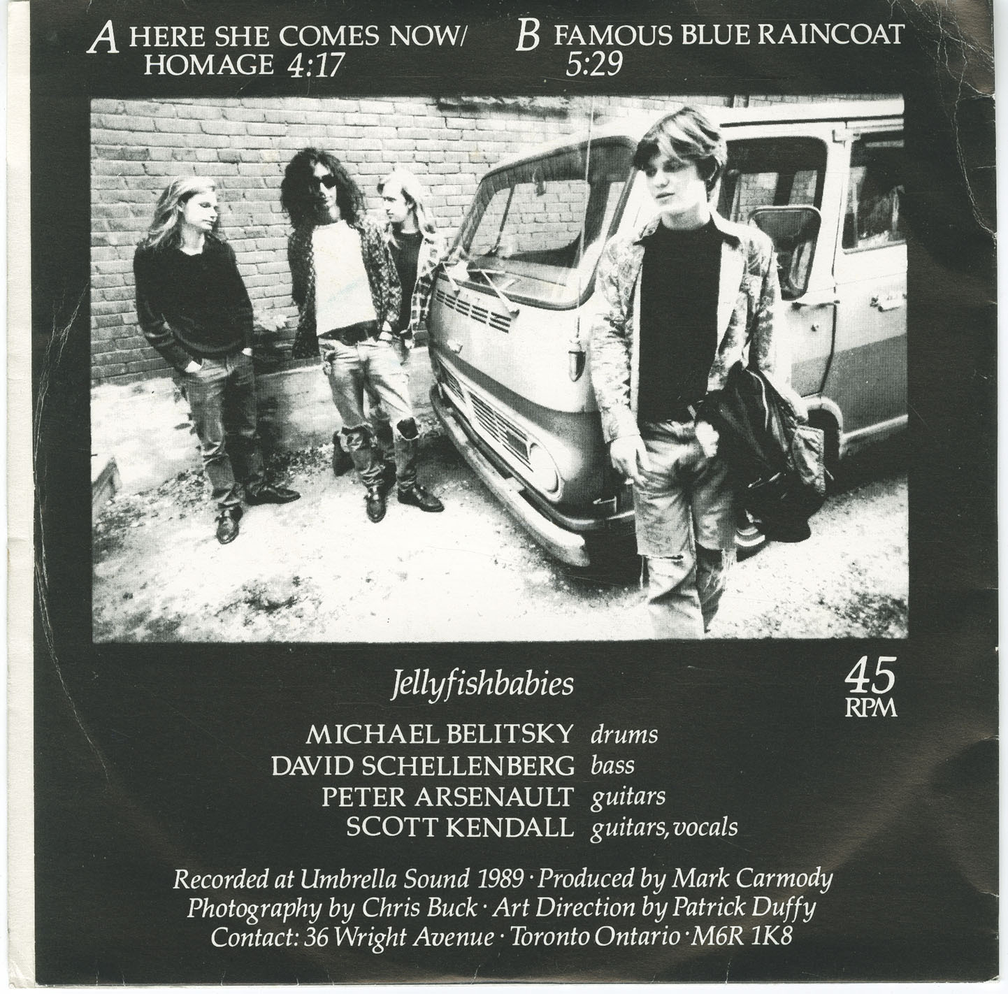 By the late 1980s, as Halifax’s infrastructure for independent bands remained limited, Jellyfishbabies made the now-familiar east-to-Toronto migration in pursuit of broader opportunities. In 1989, the group relocated to Toronto, with drummer Michael Belitsky joining the lineup following the move. The shift brought new momentum and access to a larger industry ecosystem, while preserving the band’s distinctly Halifax-rooted sensibility.