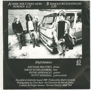 Formed in Halifax, Nova Scotia in 1986, the group centred on vocalist and guitarist Scott Kendall, with guitarist Peter Arsenault, bassist David Schellenberg, and an early rhythm section that evolved during the band’s formative years. Jellyfishbabies quickly distinguished themselves on the local circuit, releasing an independently issued self-titled album in 1986 that reportedly rose to the top of CKDU-FM’s local charts within days of release—an early indicator of the band’s strong campus-radio appeal.